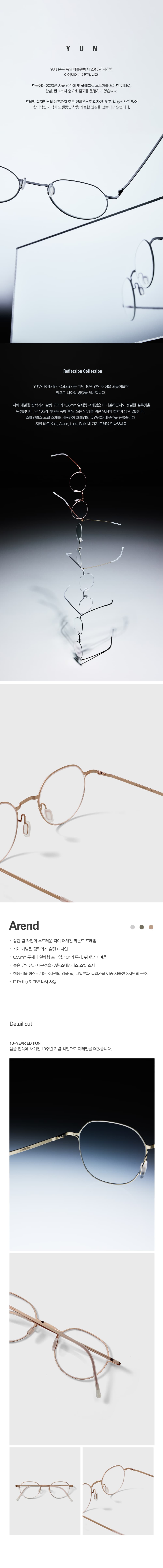 상단 림 라인의 부드러운 각이 더해진 라운드 프레임, 자체 개발된 림락리스 슬릿 디자인과 0.55mm 두께의 일체형 프레임이 특징입니다. 10g의 무게, 뛰어난 가벼움, 높은 유연성과 내구성을 갖춘 스테인리스 스틸 소재와 착용감을 향상시키는 3차원의 템플 팁으로 설계되었으며 나일론과 실리콘을 이중 사출한 3차원의 구조와 IP Plating & OBE 나사를 사용하였습니다.
