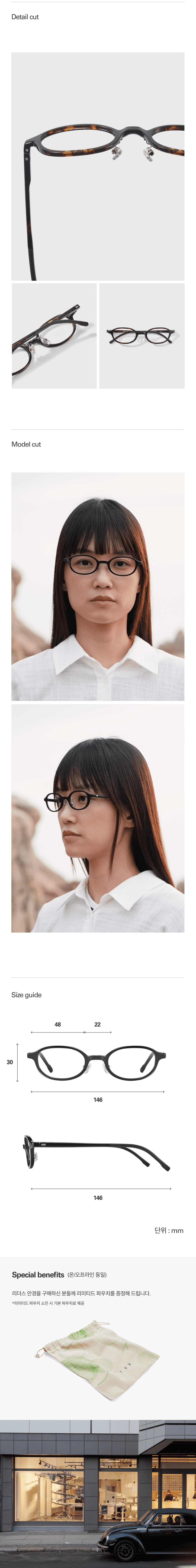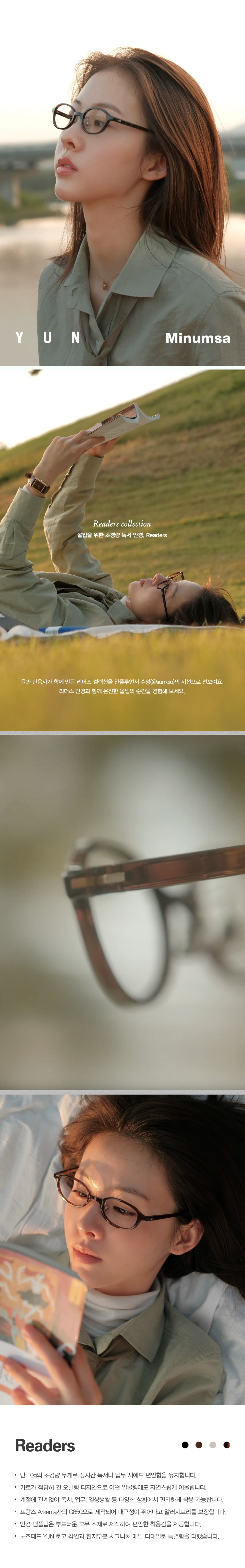 부드러운 고무 소재로 제작된 안경 템플팁은 편안한 착용감을 제공하고, 노즈패드 YUN 로고 각인과 힌지부분 시그니처 메탈 디테일로 특별함을 더했습니다.